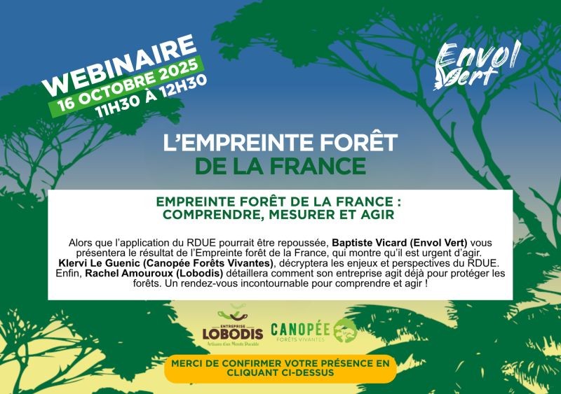 Le webinaire « Empreinte forêt de la France – Comprendre, Mesurer, Agir« est organisé à l’occasion de la sortie du nouveau rapport d’Envol Vert « Empreinte forêt 2025 de la France ».